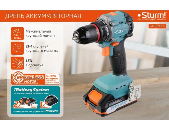 Шуруповерт Б/Щ 1BatterySystem STURM 60Нм, 2АКБ*2Ач+ЗУ, металл БЗП, LED, КЕЙС (1/5)