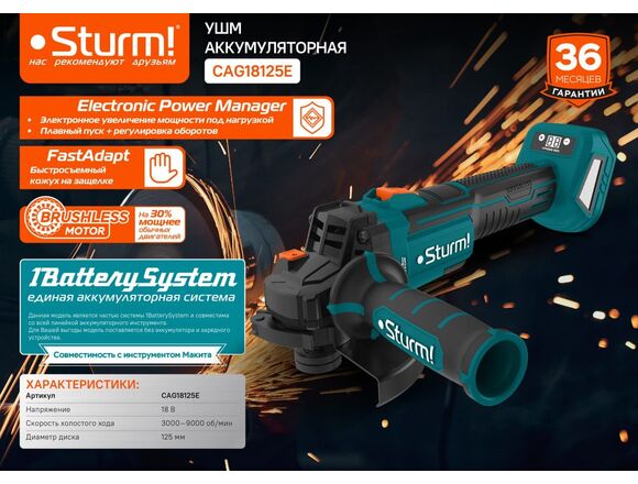 Аккумуляторная углошлифовальная машина Sturm CAG18125E оснащена бесщеточным двигателем, что увеличивает мощность, продолжительность работы и ресурс.