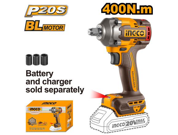 Гайковерт Б/Щ УДАРНЫЙ "20V MAX" INGCO INDUSTRIAL 1/2" 400нм, без АКБ/ЗУ, 3 головки (1/5)