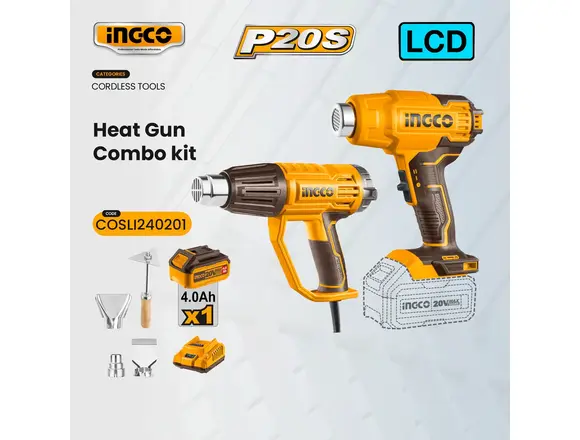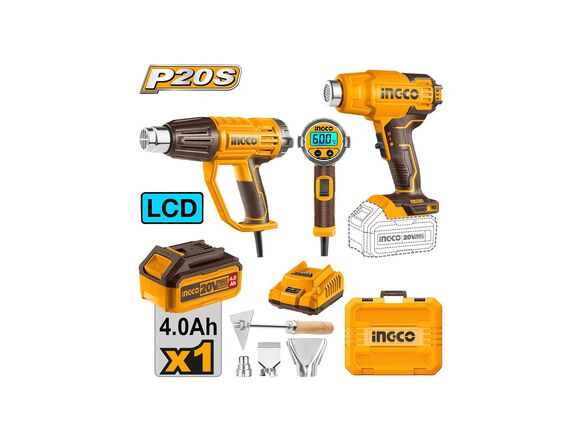 Набор "АКЦИЯ" INGCO фен строительный "20V MAХ"(1АКБ*4Ач+ЗУ) + сетевой LCD 2000Вт, КЕЙС+набор насадок