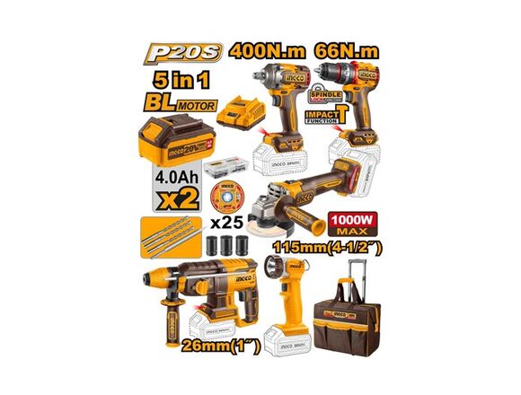 Набор Б/Щ "20V MAX" INGCO 5 в 1 СУМКА на КОЛЕСАХ (Шур 66Нм+Гайк 400Нм+УШМ115/125мм+Перф 26мм+Фонарь)