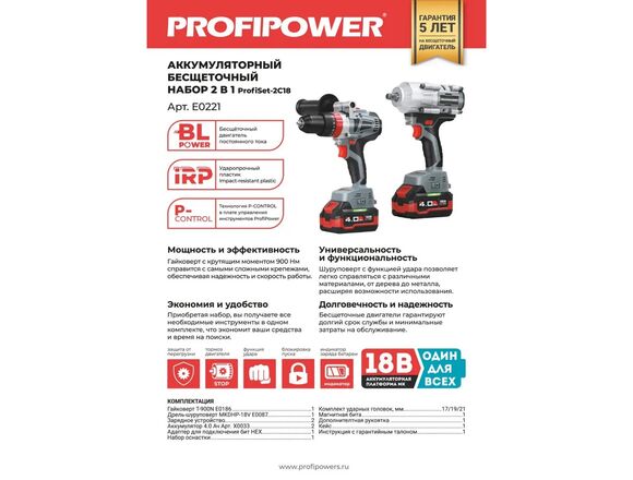 НАБОР Б/Щ 2в1 PROFIPOWER в КЕЙСЕ (Гайковерт 900Нм E0186 и шуруповерт 90Нм Т0087) АКБ2*4Ач+З/У (1/5)