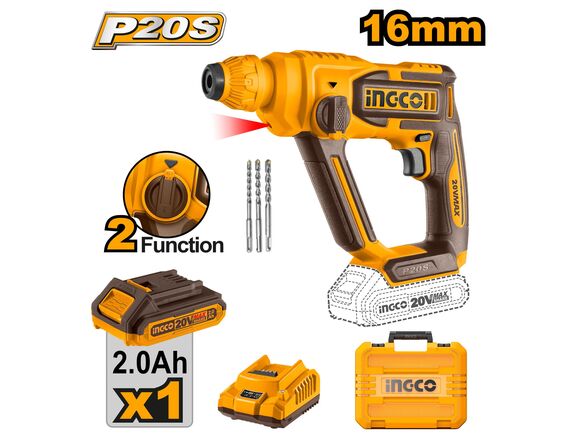Перфоратор "20V MAX" INGCO 1,5Дж, 2 режима, 1АКБ*2Ач + ЗУ, КЕЙС (1/4)