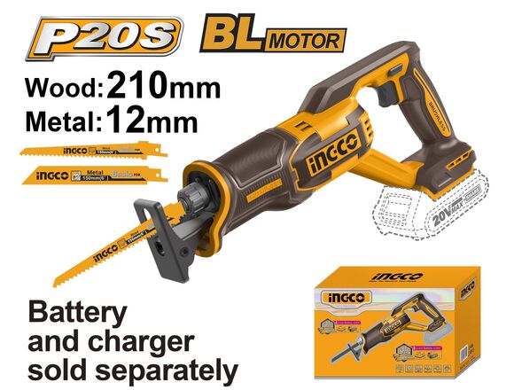 Пила сабельная Б/Щ "20V MAX" INGCO INDUSTRIAL 12мм МЕТАЛЛ / 210мм ДЕРЕВО (без АКБ/ЗУ)(1/4)