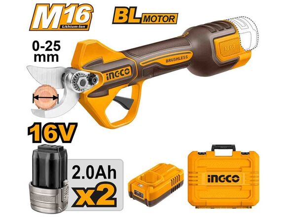 Секатор АККУМ Б/Щ "M16" INGCO INDUSTRIAL 16В, 0-25мм, 2АКБ*2Ач+ЗУ, КЕЙС (1/6)