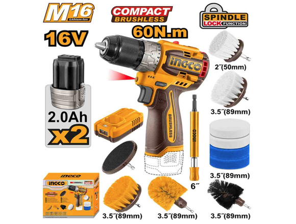 Шуруповерт Б/Щ "M16" "АКЦИЯ" INGCO INDUSTRIAL 60Нм, БЗП МЕТАЛЛ 13мм, 2АКБ*2Ач + ЗУ, набор ЩЕТОК + уд
