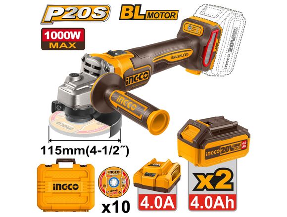 УШМ Б/Щ "20V MAX INGCO INDUSTRIAL 115/125мм (1000Вт / 3 скорости), 2АКБ*4Ач+ЗУ кейс (1/4)