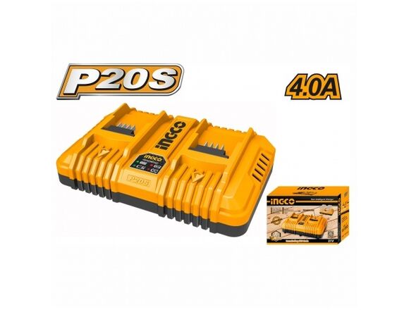 Двойное зарядное устройство INDUSTRIAL 2x21B, 4 A*ч INGCO FCLI2034 применеяется для зарядки аккумуляторов с напряжением 20В. Подходит для всех аккумуляторных инструментов семейства P20S.