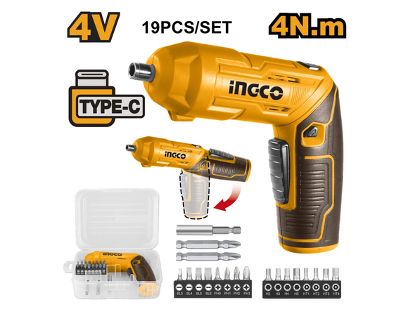 Отвертка аккумуляторная INGCO 4В/4Нм + 19 бит/держатель в кейсе, ручка 2К (1/10/20)