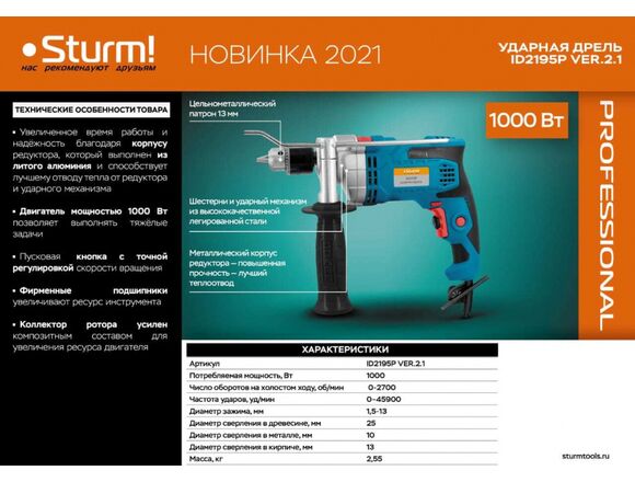 Ударная дрель Sturm ID2195P - инструмент профессионального класса.