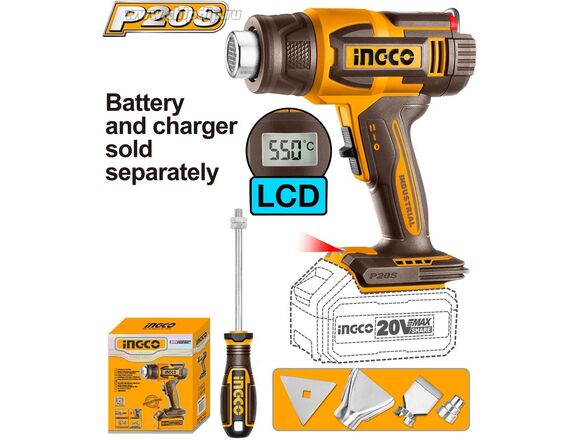 Фен "20V MAX" INGCO INDUSTRIAL 20В, 30-300/30-550°C, ЖК-дисплей, без АКБ и ЗУ (1/5)