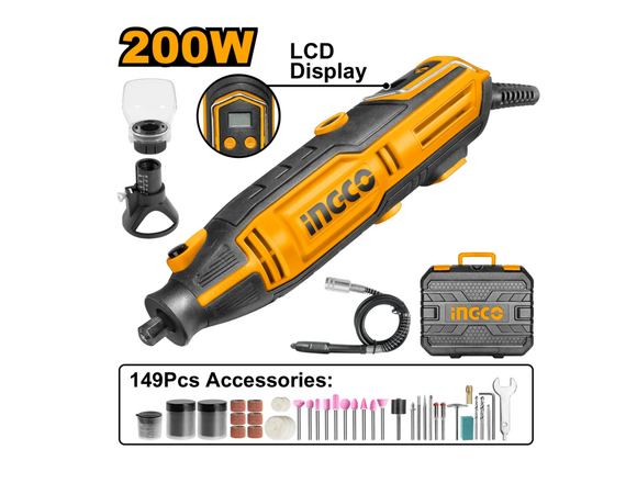 Гравер INGCO 200Вт, LCD-дисплей, 6 режимов, гибкий вал, КЕЙС + 149 предметов (1/5)