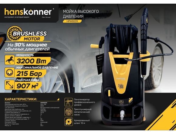 Мойка высокого давления HANSKONNER 3200Вт 215бар асинхронный мотор шланг 10м, БАРАБАН для шланга (1