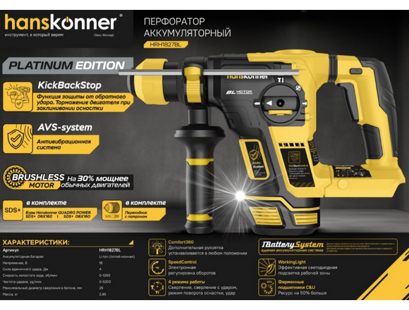 Перфоратор 1BatterySystem Б/Щ HANSKONNER PLATINUM 18В, 2,8Дж, 3режима, БЗП13мм/буры, без АКБ-ЗУ (1/6