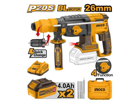 Перфоратор Б/Щ "20V MAX" INGCO INDUSTRIAL 2,5Дж, 4 режима,2АКБ*4Ач+ЗУ СЪЁМНЫЙ ПАТРОН (1/4)