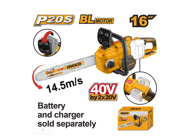 Пила цепная Б/Щ "20V MAX" INGCO INDUSTRIAL шина 40см, 40В (20+20), без АКБ и ЗУ (1/2)
