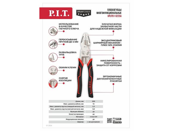Плоскогубцы P.I.T. 225мм 6 в 1, DRUA POWER, +50% МФУ усиленные