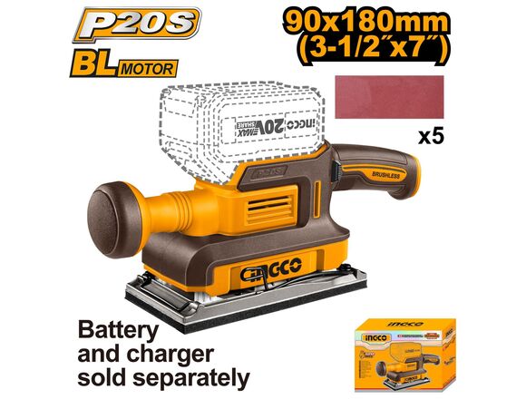 Шлифмашина вибрационная Б/Щ "20V MAX" INGCO INDUSTRIAL 187*90мм, без АКБ/ЗУ (1/8)