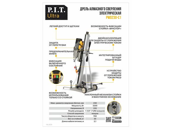 Дрель алмазного сверления P.I.T. ULTRA 3200Вт, 700об/мин, ⌀230мм, 1-1/4'', НАКЛОННАЯ СТАНИНА(1/1)