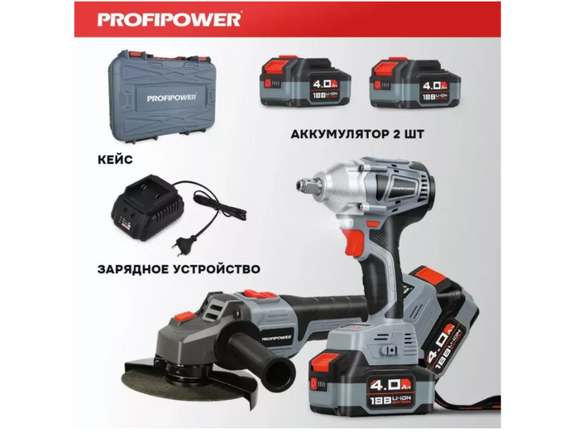 НАБОР Б/Щ 2в1 PROFIPOWER в КЕЙСЕ (УШМ E0080 и гайковерт E0081 (18В, АКБ2*4Ач + З/У) (1/5)