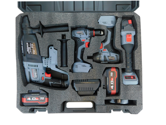 НАБОР Б/Щ 4в1 КЕЙСЕ УШМ E0080+гайковерт E0081+перф Т0058 + шуруп T0056 (АКБ2*4Ач,З/У) (1/3)