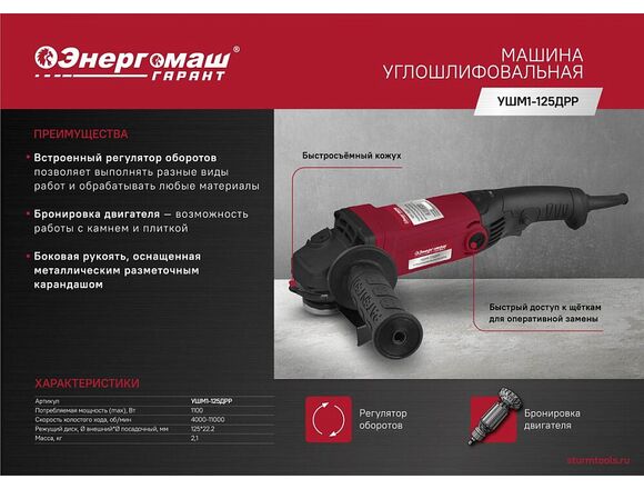 УШМ ЭНЕРГОМАШ 125мм, 1100Вт ГАРАНТ, удлиненная ручка, рег-ка 4000-11000об/мин, ЧЕРТИЛКА(1/6)