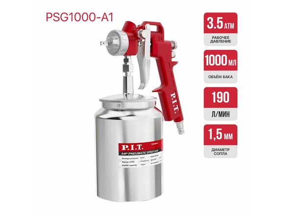Краскопульт пневматический P.I.T. нижний бачок 1000мл, сопло 1,5мм, 190л/мин (краска 260мл/мин),1/10