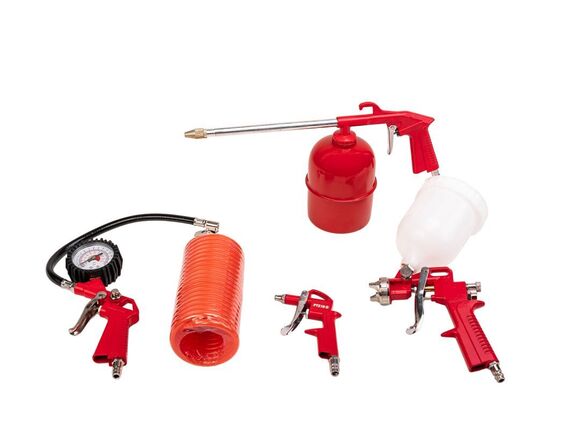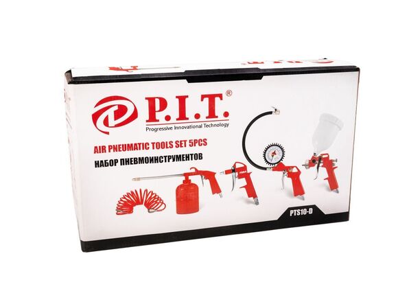 Набор пневмоинструмента P.I.T. СТАНДАРТ PTS10-D отличается внушительным рабочим ресурсом. Комплектуется пистолетами для промывки, продувки и подкачки шин, а также краскопультом с верхним бачком. Спиральный пневмошланг длиной 5 метров обеспечивает стабильную работу инструментов на удалении от питающего компрессора. Наличие манометра на пистолете для подкачки шин позволяет визуально контролировать уровень давления.
