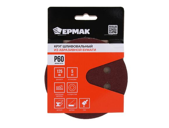 Круг абразивный под липучку ЕРМАК 125мм P 60 (5шт/уп) 8 отверстий,