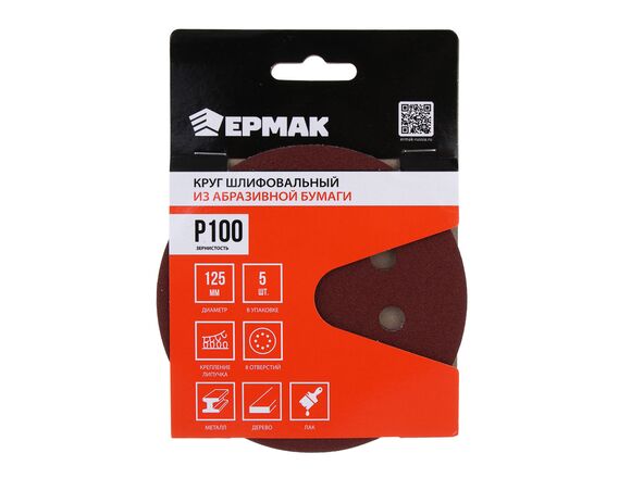 Круг абразивный под липучку ЕРМАК 125мм P100 (5шт/уп) 8 отверстий