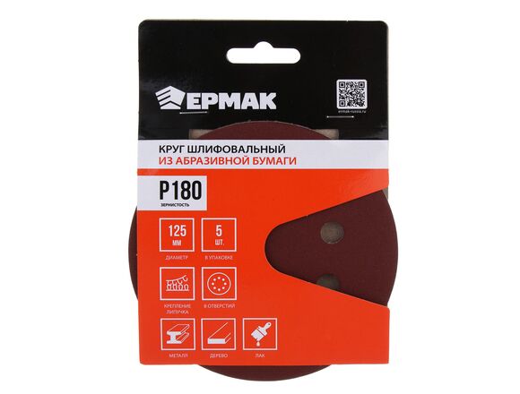 Круг абразивный под липучку ЕРМАК 125мм P180 (5шт/уп) 8 отверстий