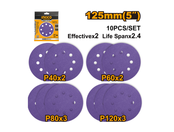 Набор шлифовальных кругов 125 мм INGCO INDUSTRIAL 10шт ( P40 P60 P80 P120 )(10/40)