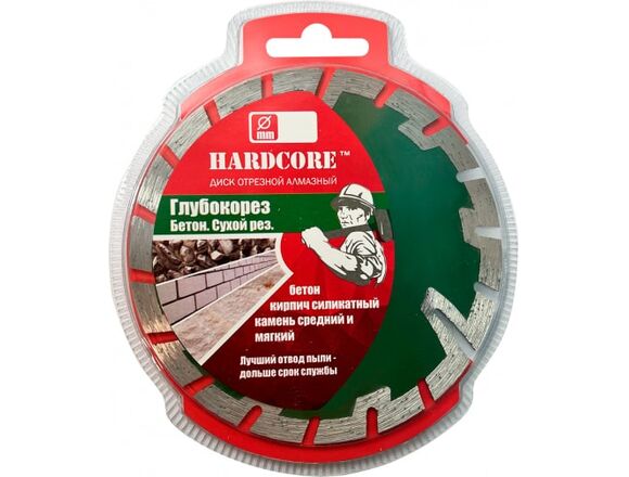 Диск отрезной алмазный сухой рез ГЛУБОКОРЕЗ 230х22.23 мм Hardcore 185230 применяется для глубоких прорезов в бетоне, железобетоне, кирпиче, камне. Алмазный слой заходит внутрь корпуса диска и предохраняет его от истирания при глубоком резе материала. Углублённые многочисленные наклонные промежутки между сегментами обеспечивают улучшенный вывод шлама, который иначе негативно сказывается на сроке службы диска.