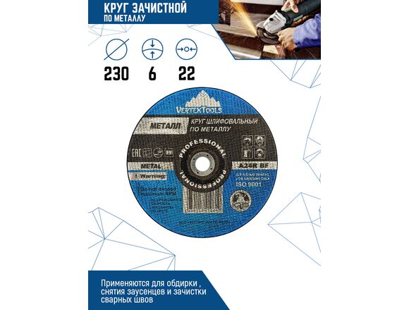 Круг зачистной по металлу 230x6х22 мм vertextools 230-6-22 применяется для силового шлифования деталей и конструкций из различных марок сталей. Зачистка сварных и угловых швов, снятие фаски и т.д. Универсальное применение в промышленном и ремесловом производстве. Подходят для угловых шлифмашин всех типов и марок.