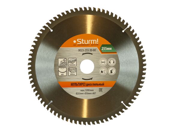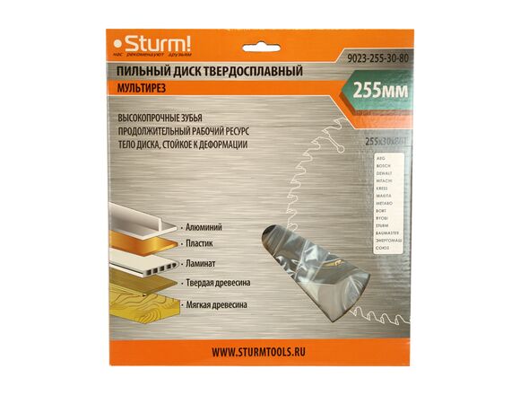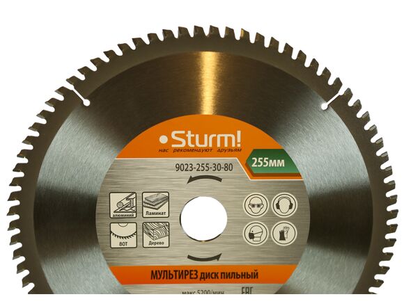 Диск пильный Мультирез (255x30; 80 зубьев) Sturm 9023-255-30-80 предназначен для резки различных материалов: алюминиевый профиль, цветные металлы, пластик, комбинированные материалы, дерево, дерево с гвоздями. Зубья выполнены из высококачественного карбида вольфрама, что обеспечивает продолжительный рабочий ресурс и снижение нагрузки на инструмент. Угол заточки в +12° позволяет работать с разными материалами, как с цветными металлами, так и с мягкими породами деревьев. Диск изготовлен из высококачественной стали 65Mn.