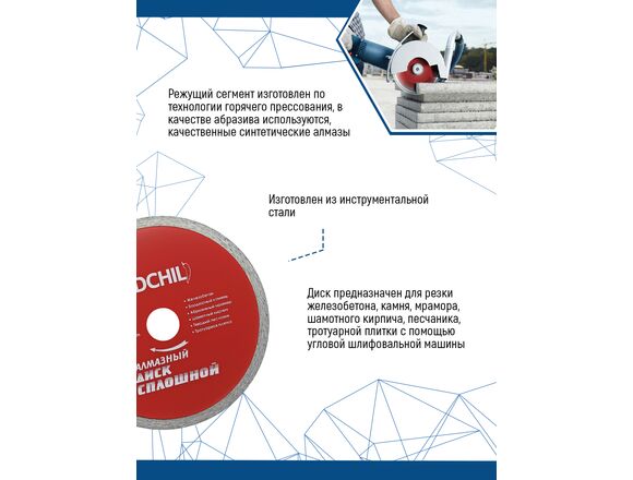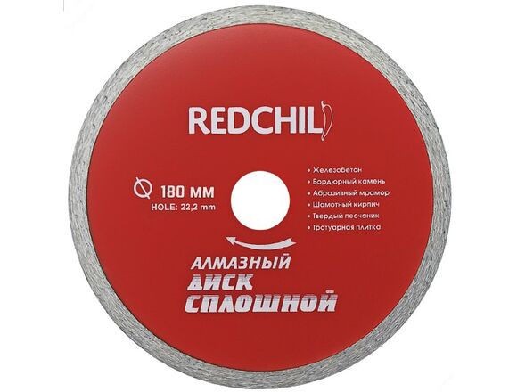 Алмазный диск сплошной 180х22 мм Redchili 07-07-07-17 предназначен для резки железобетона, камня, мрамора, шамотного кирпича, песчаника, тротуарной плитки с помощью угловой шлифовальной машины.