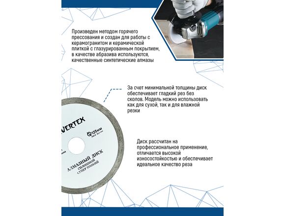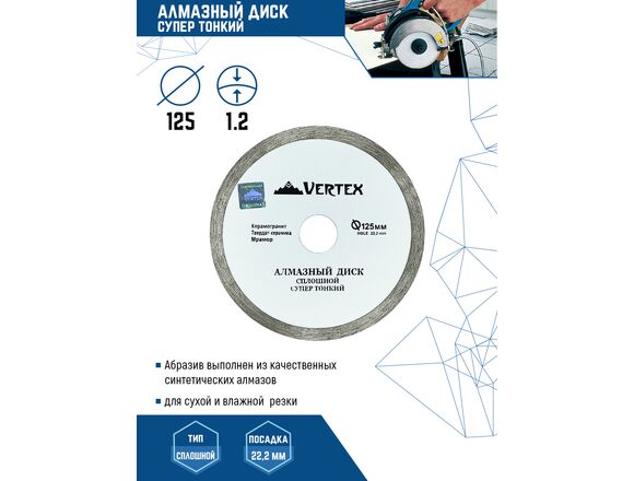 Диск алмазный отрезной Vertextools 04-125-12 Супер Тонкий изготовлен из инструментальной стали. При изготовлении режущего слоя применяется технология горячего прессования. Высота режущего слоя - 10 мм, толщина 1,2 - 1.3мм . Абразив выполнен из качественных синтетических алмазов. Применяется для сухой резки бетона, гранита, камня и других материалов. Использование - профессиональное.