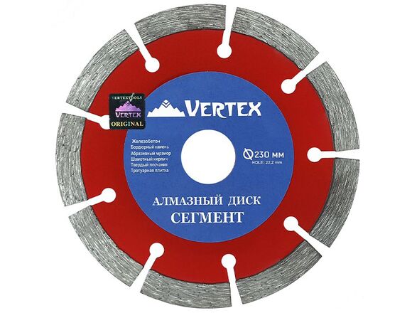 Алмазный диск Vertextools 04-230-9 Сегмент изготовлен из инструментальной стали, оснащен компенсационными прорезями, уменьшающими колебания, шумы, перегрев и деформацию диска. Режущий сегмент изготовлен по технологии горячего прессования, в качестве абразива используются, качественные синтетические алмазы. Диск предназначен для профессионального использования. Применяется для сухой резки: армированного бетона, гранита, кирпича, камня и других строительных материалов.