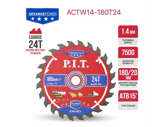 Диск пильный с твердосплавными напайками по дереву для циркулярных и торцовочных пил ACTW14-180T24 отличный вариант для распила древесины, досок, многослойных плит, древесностружечных плит (ДСП, OSB, фанеры и т.д.).