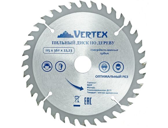 Пильный диск по дереву Vertextools 115-36-22 предназначен для выполнения точных продольных и поперечных чистовых пропилов в мягкой и твердой древесине, прессованной слоистой древесине, фанере, ламинате и ДСП. Напаянные индуктивным способом твердосплавные переменные зубья с агрессивным углом резания обеспечивают одновременно быстрое и точное пиление. Чистота распила зависит от количества зубьев и расстояния между ними. Чем больше зубья, тем чище распил. Основа выполнена из углеродистой стали, напайки на зубах из карбидно-вольфрамового сплава (победита).
