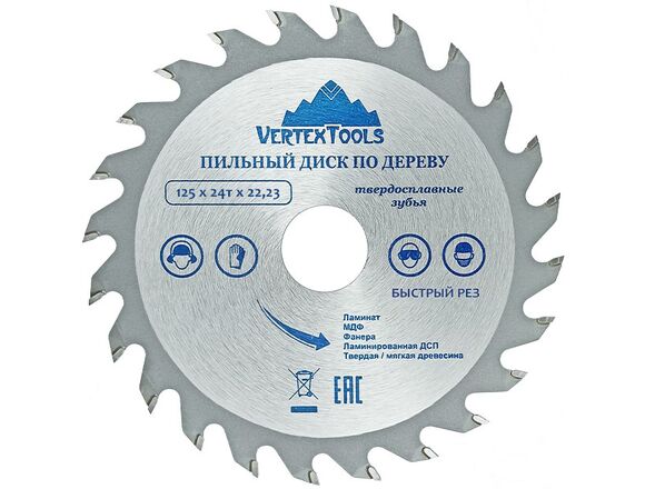 Пильный диск по дереву Vertextools 125-24-22 предназначен для выполнения точных продольных и поперечных чистовых пропилов в мягкой и твердой древесине, прессованной слоистой древесине, фанере, ламинате и ДСП.Напаянные индуктивным способом твердосплавные переменные зубья с агрессивным углом резания обеспечивают одновременно быстрое и точное пиление. Чистота распила зависит от количества зубьев и расстояния между ними. Чем больше зубья, тем чище распил. Основа выполнена из углеродистой стали, напайки на зубах из карбидно-вольфрамового сплава (победита).