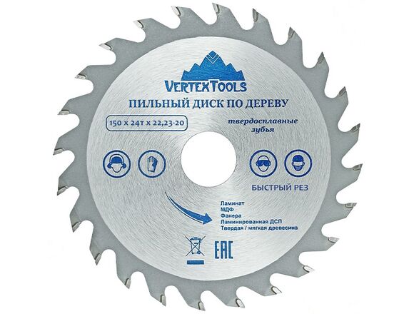 Пильный диск по дереву Vertextools 150-24-22 предназначен для выполнения точных продольных и поперечных чистовых пропилов в мягкой и твердой древесине, прессованной слоистой древесине, фанере, ламинате и ДСП.Напаянные индуктивным способом твердосплавные переменные зубья с агрессивным углом резания обеспечивают одновременно быстрое и точное пиление. Чистота распила зависит от количества зубьев и расстояния между ними. Чем больше зубья, тем чище распил. Основа выполнена из углеродистой стали, напайки на зубах из карбидно-вольфрамового сплава (победита).