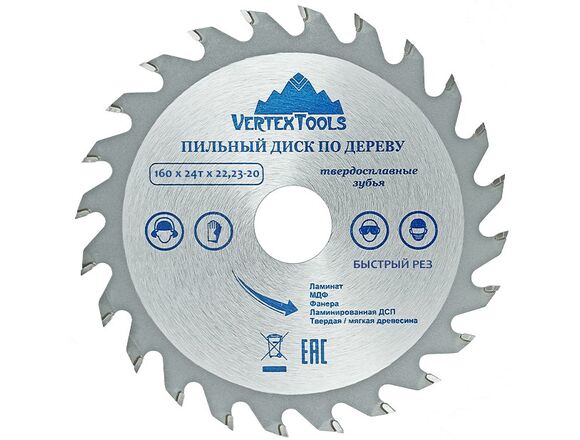 Пильный диск по дереву Vertextools 160-24-22 предназначен для выполнения точных продольных и поперечных чистовых пропилов в мягкой и твердой древесине, прессованной слоистой древесине, фанере, ламинате и ДСП. Напаянные индуктивным способом твердосплавные переменные зубья с агрессивным углом резания обеспечивают одновременно быстрое и точное пиление. Чистота распила зависит от количества зубьев и расстояния между ними. Чем больше зубья, тем чище распил. Основа выполнена из углеродистой стали, напайки на зубах из карбидно-вольфрамового сплава (победита).