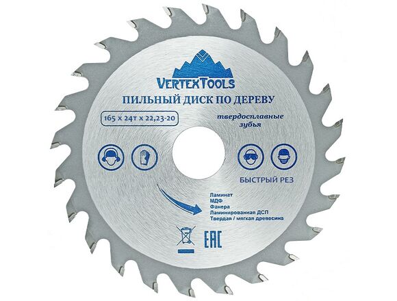 Пильный диск по дереву Vertextools 165-24-22 предназначен для выполнения точных продольных и поперечных чистовых пропилов в мягкой и твердой древесине, прессованной слоистой древесине, фанере, ламинате и ДСП. Напаянные индуктивным способом твердосплавные переменные зубья с агрессивным углом резания обеспечивают одновременно быстрое и точное пиление. Чистота распила зависит от количества зубьев и расстояния между ними. Чем больше зубья, тем чище распил. Основа выполнена из углеродистой стали, напайки на зубах из карбидно-вольфрамового сплава (победита).