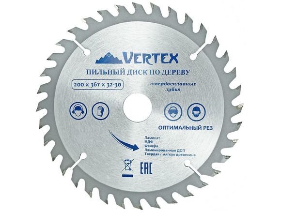 Пильный диск по дереву ertextools 200-36-32 предназначен для выполнения точных продольных и поперечных чистовых пропилов в мягкой и твердой древесине, прессованной слоистой древесине, фанере, ламинате и ДСП. Напаянные индуктивным способом твердосплавные переменные зубья с агрессивным углом резания обеспечивают одновременно быстрое и точное пиление. Чистота распила зависит от количества зубьев и расстояния между ними. Чем больше зубья, тем чище распил. Основа выполнена из углеродистой стали, напайки на зубах из карбидно-вольфрамового сплава (победита).
