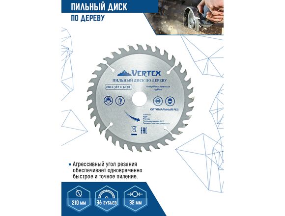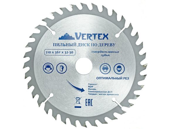 Пильный диск по дереву Vertextools 210-36-32 предназначен для выполнения точных продольных и поперечных чистовых пропилов в мягкой и твердой древесине, прессованной слоистой древесине, фанере, ламинате и ДСП. Напаянные индуктивным способом твердосплавные переменные зубья с агрессивным углом резания обеспечивают одновременно быстрое и точное пиление. Чистота распила зависит от количества зубьев и расстояния между ними. Чем больше зубья, тем чище распил. Основа выполнена из углеродистой стали, напайки на зубах из карбидно-вольфрамового сплава (победита).