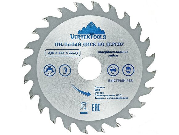 Пильный диск по дереву Vertextools 230-24-22 предназначен для выполнения точных продольных и поперечных чистовых пропилов в мягкой и твердой древесине, прессованной слоистой древесине, фанере, ламинате и ДСП.