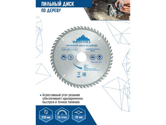 Пильный диск по дереву Vertextools 230-56-22 предназначен для выполнения точных продольных и поперечных чистовых пропилов в мягкой и твердой древесине, прессованной слоистой древесине, фанере, ламинате и ДСП. Напаянные индуктивным способом твердосплавные переменные зубья с агрессивным углом резания обеспечивают одновременно быстрое и точное пиление. Чистота распила зависит от количества зубьев и расстояния между ними. Чем больше зубья, тем чище распил. Основа выполнена из углеродистой стали, напайки на зубах из карбидно-вольфрамового сплава (победита).