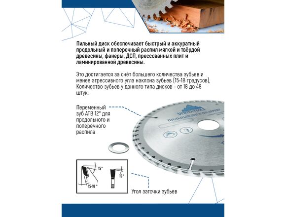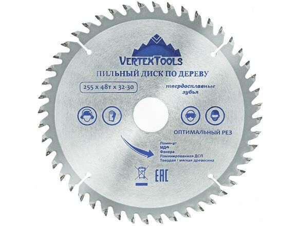 Пильный диск по дереву Vertextools 255-48-32 предназначен для выполнения точных продольных и поперечных чистовых пропилов в мягкой и твердой древесине, прессованной слоистой древесине, фанере, ламинате и ДСП. Напаянные индуктивным способом твердосплавные переменные зубья с агрессивным углом резания обеспечивают одновременно быстрое и точное пиление. Чистота распила зависит от количества зубьев и расстояния между ними. Чем больше зубья, тем чище распил. Основа выполнена из углеродистой стали, напайки на зубах из карбидно-вольфрамового сплава (победита).