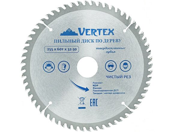 Пильный диск по дереву Vertextools 255-60-32 предназначен для выполнения точных продольных и поперечных чистовых пропилов в мягкой и твердой древесине, прессованной слоистой древесине, фанере, ламинате и ДСП. Напаянные индуктивным способом твердосплавные переменные зубья с агрессивным углом резания обеспечивают одновременно быстрое и точное пиление. Чистота распила зависит от количества зубьев и расстояния между ними. Чем больше зубья, тем чище распил. Основа выполнена из углеродистой стали, напайки на зубах из карбидно-вольфрамового сплава (победита).